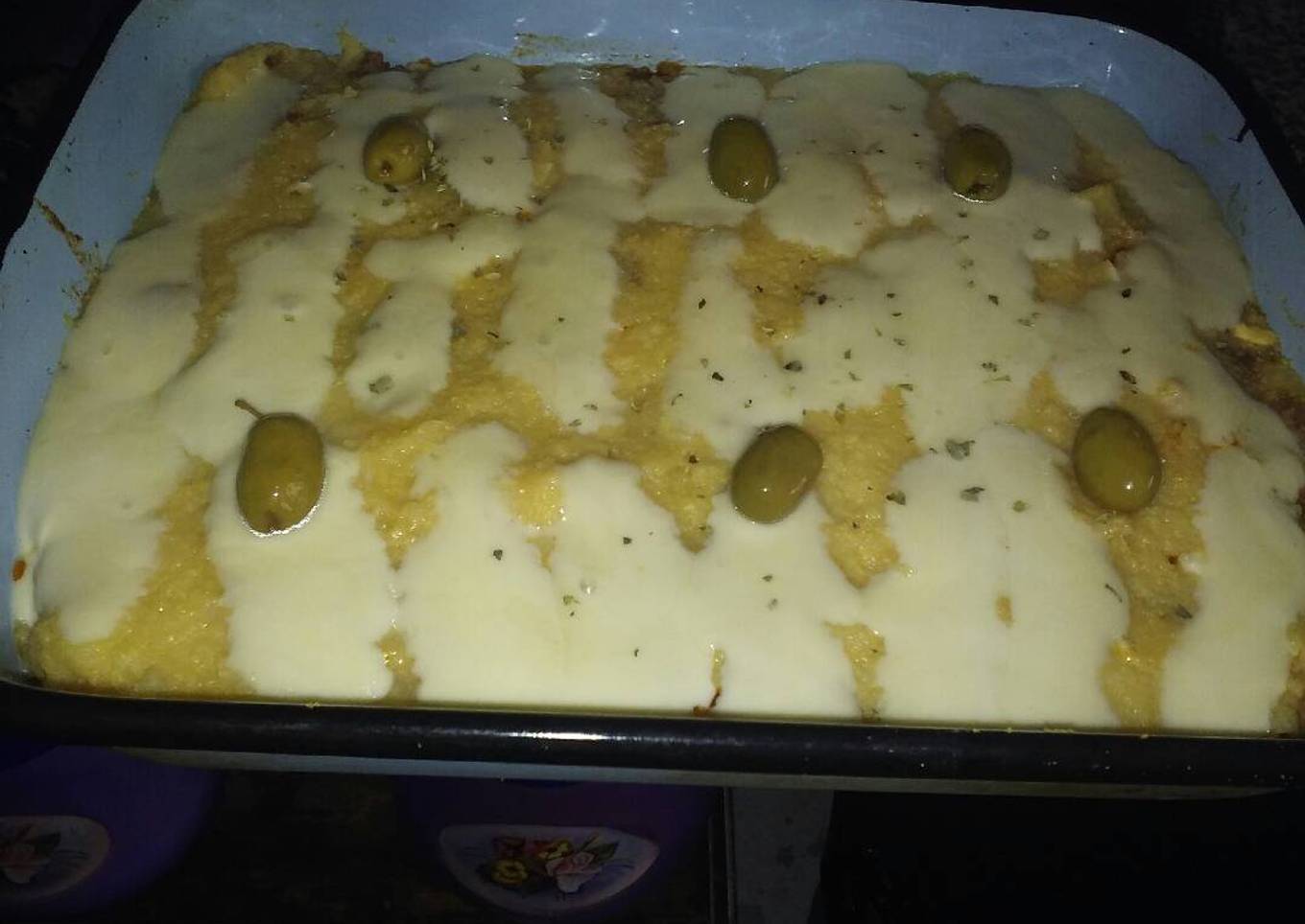 - Ya casi terminamos !!! ponemos la ultima capa de polenta por encima del tuco y cortar queso cremoso en cubos o alargados y lo ponemos encima,ahora llevamos al horno y a esperar q el queso se derrita y una vez derretido ponemos aceitunas enteras o cortaditas y listo que disfruten mucho la recetaa!!!