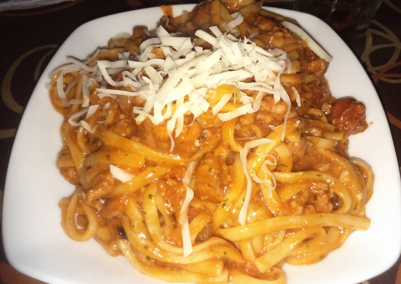 Tallarines con chistorra y carne picada