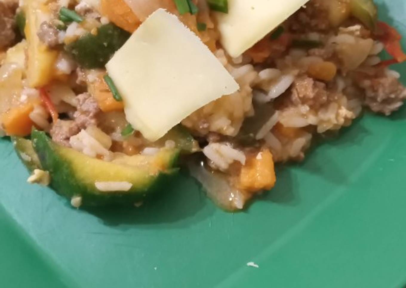 - A los 20' agregar la carne picada y el zapallito con los champis.Condimentar y agregar más caldo.Y verdeo.Cocinar 10' más