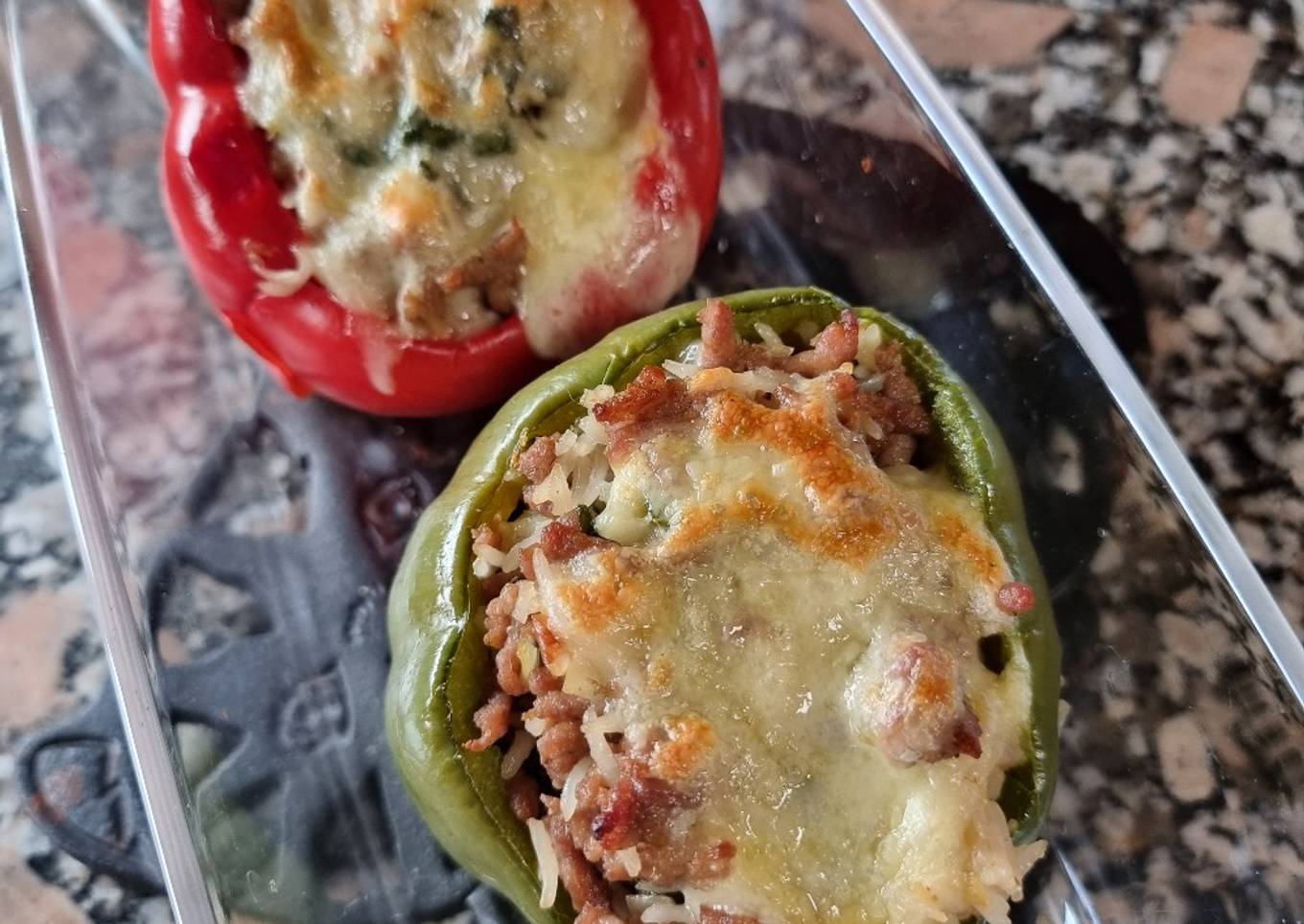 - Mezclamos el arroz cocido con la carne y rellenamos los pimientos. Espolvoreamos con el queso rallado y metemos al horno unos 10-15 minutos, o hasta que veamos que ha gratinado el queso. Sacamos y servimos.